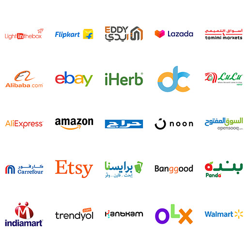 , Amazon, AliExpress, noon, , Alibaba, eBay, iHerb, Desertcart, LuLu Hypermarket, , Etsy, Pricena, Banggood, Panda, IndiaMART, Trendyol, Kanbkam,
