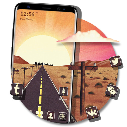 Desert Sunrise Road Launcher Theme provides delicate app icons, wallpapers, folder and app drawer interface.