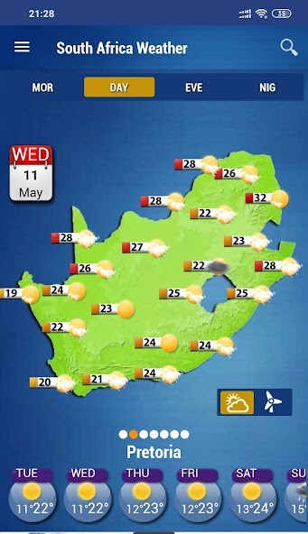 South Africa Weather app provides accurate weather forecasts (wind, humidity, tides, solunar activity, ephemeris, alerts) cities in SA for seven coming days.