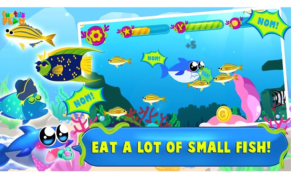 Do you know that shark, orca whale and dolphin are carnivores, it means they eat meat! In this case, they eat other fishes! Can you help these fishes on their first hunt, learning which fish is yummy and which fish is dangerous for them? feed fish and grow baby shark