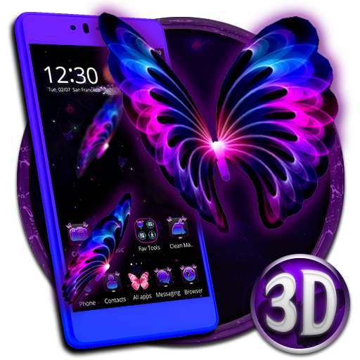 Welcome to 3D Neon Butterfly Galaxy Themeï¼ 3D Neon Butterfly Galaxy is a 3D launcher theme with 3D Neon Butterfly Galaxy live wallpapers and designed icon packs.