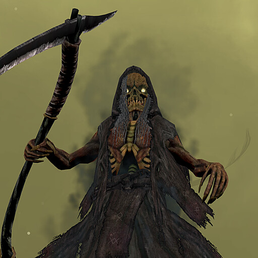 The Grim Reaper is here with a dark hooded cloak, wielding a scythe, and surrounded by a void with occasional lightning strikes.